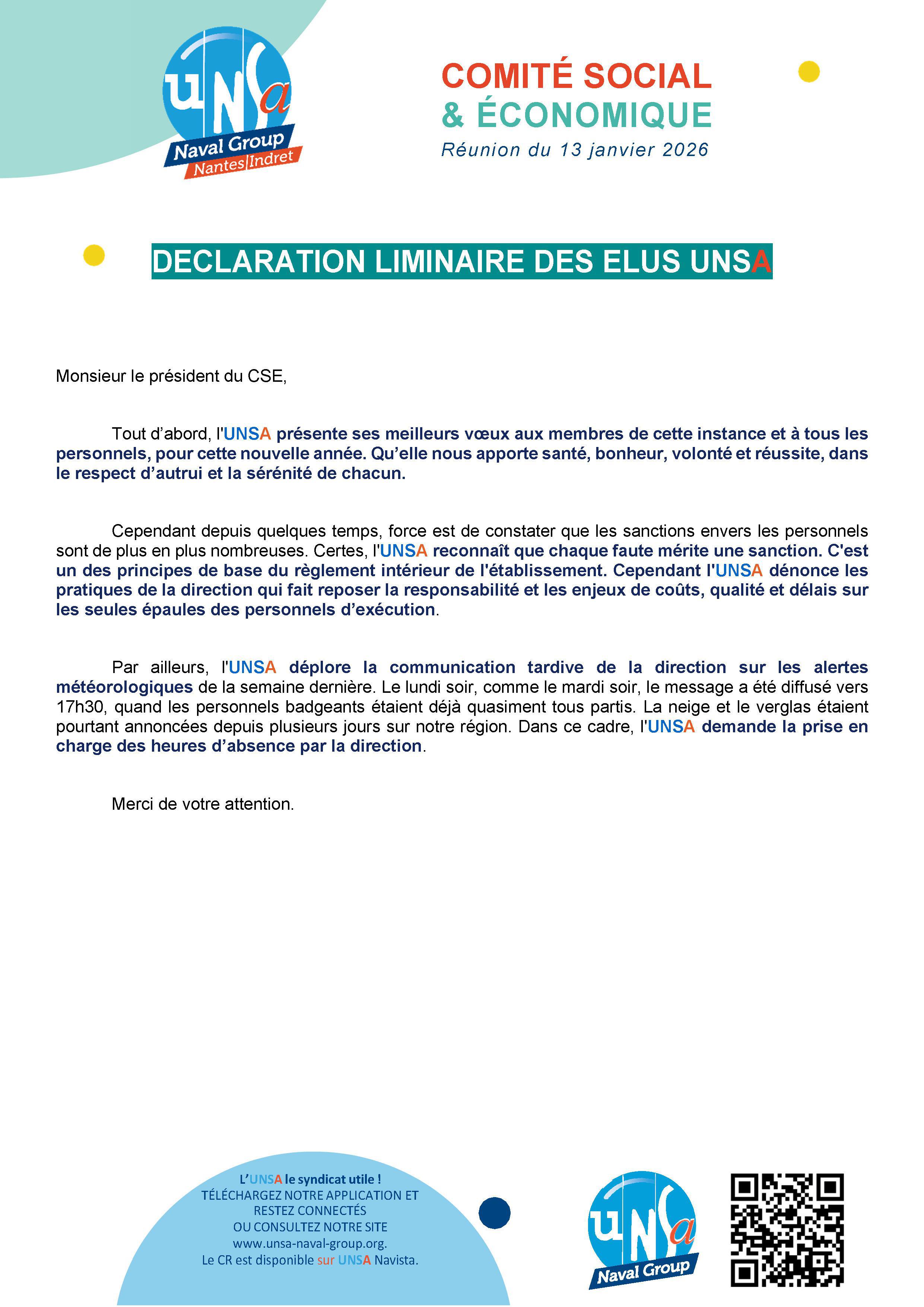 CSE Nantes/Indret - Réunion du 13 janvier 2026 - Déclaration Liminaire