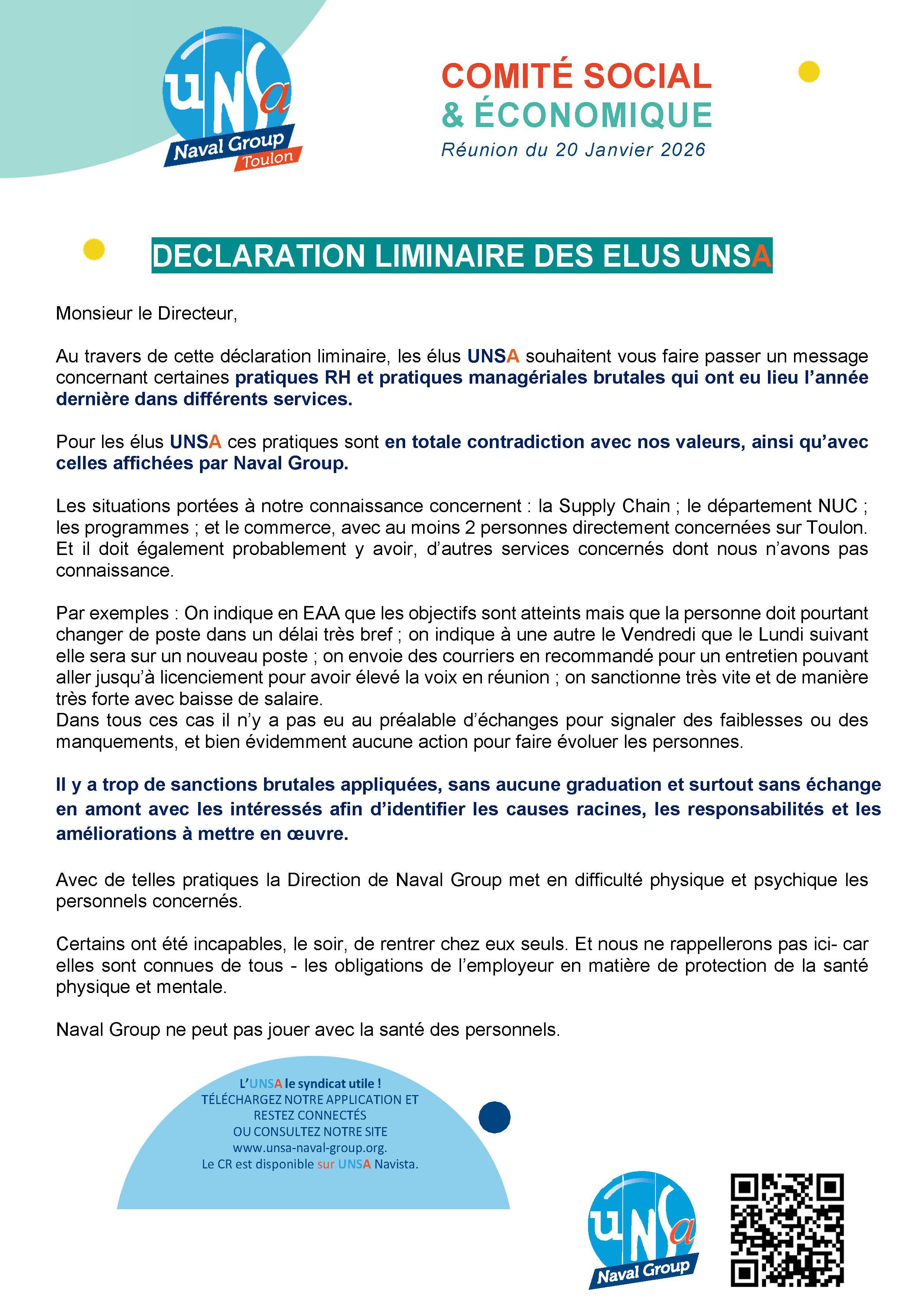 CSE de Toulon - Réunion du 20 janvier 2026 - Déclaration liminaire
