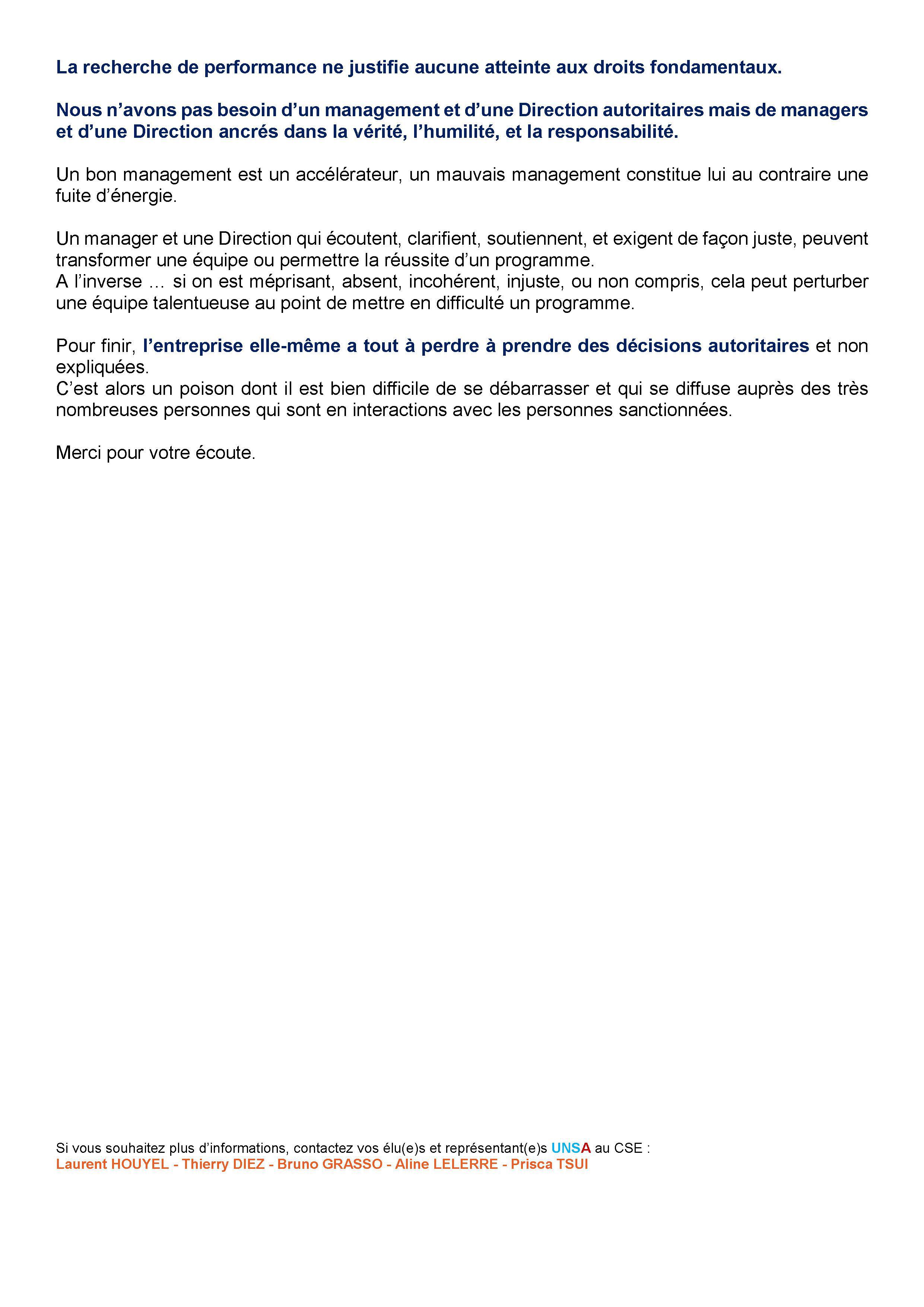 Au travers de cette déclaration liminaire, les élus UNSA souhaitent vous faire passer un message concernant certaines pratiques RH et pratiques managériales brutales qui ont eu lieu l’année dernière dans différents services.